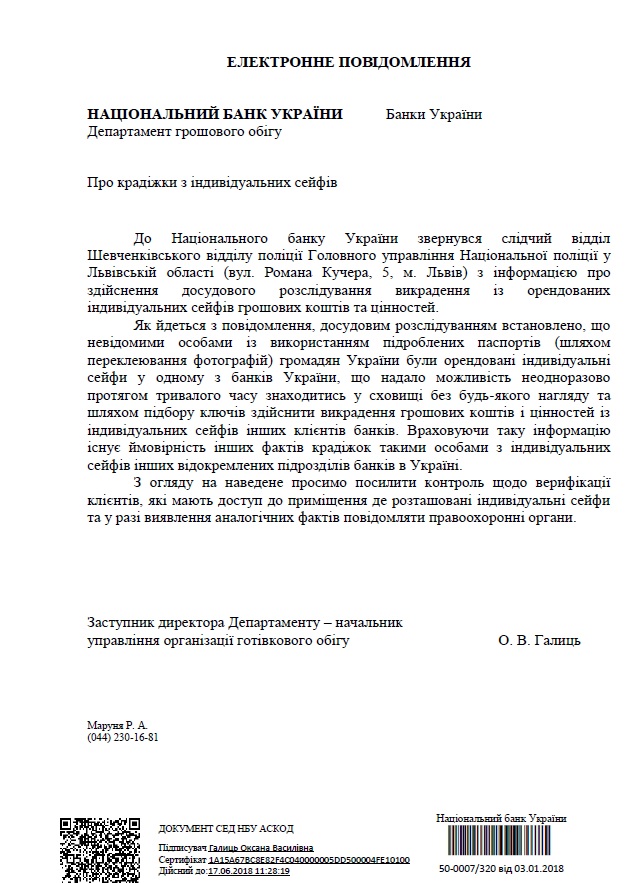 Однако новое письмо центробанка привязано не к киевским историям, а к новым - львовским. В Национальный банк обратился следователи из Львова с информацией об осуществлении досудебного расследования похищения из арендованных ячеек денежных средств и ценностей.