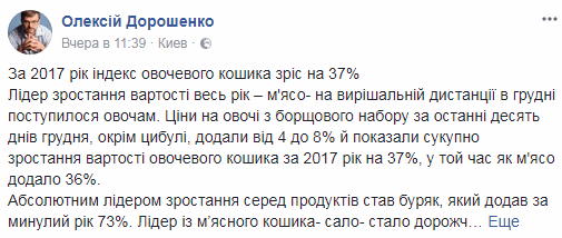 "Цены на овощи из борщового набора за последние десять дней декабря, кроме лука, добавили от 4 до 8% и показали совокупно рост стоимости овощной корзины за 2017 на 37%, в то время как мясо добавило 36%", – написал Дорошенко на своей странице в Facebook.
