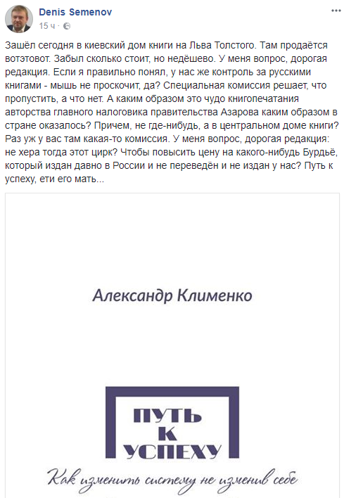 Денис Семенов рассказал, как в киевском Доме Книги на Льва Толстого продают книгу Клименко.
