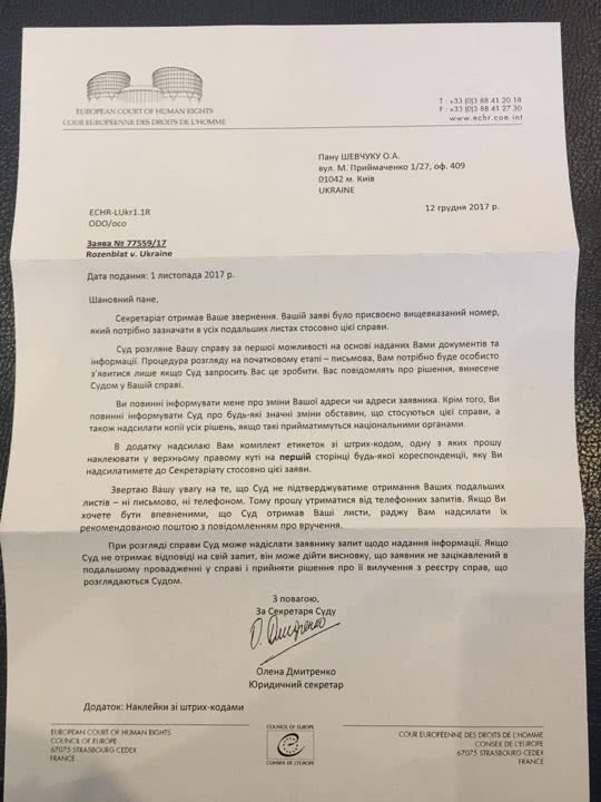 "Сегодня Европейский суд начал официальные процедуры по жалобе Розенблатта. Есть производстве" Розенблат против Украины ". Там системно собраны все нарушения профильной конвенции от незаконной прослушки народного депутата с нарушением регламента Верховной Рады к легализации ручным судьей венгерского самолета", – рассказал Шевчук.
