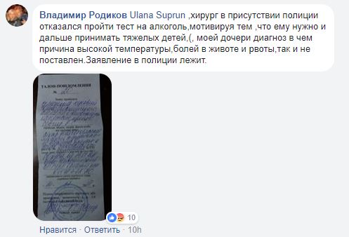 "У младшей Анастасии заболел живот, рвота, температура. Привезли в Киев.обл.детскую больницу в г. Боярка. А там празднуют по полной -отмечают ст.нов.год .Хирург лыка не вяжет. Пьяный в драбадан. Ему мол не симптомы нужны, а ему видите ли нужно установить контакт с ребенком..тв*ри..((", - написал Родиков.