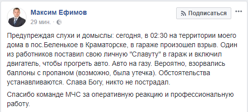 "Предупреждая слухи и домыслы: сегодня, в 02:30 наа территории моего дома в пос.Беленькое в Краматорске, в гараже произошел взрыв. Один из работников поставил свою личную "Славуту" в гараж и включил двигатель, чтобы прогреть авто. Авто на газу. Вероятно, взорвались баллоны с пропаном (возможно, была утечка). Обстоятельства устанавливаются. Слава Богу, никто не пострадал", - сообщил Ефимов.