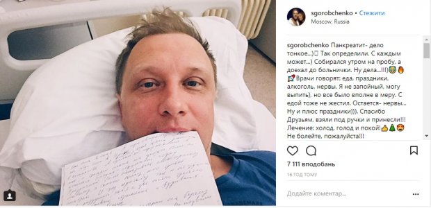 "Панкреатит — дело тонкое. Так определили. С каждым может... Собирался утром на пробу, а доехал до больницы. Врачи говорят: еда, праздники, алкоголь, нервы. Я не запойный, могу выпить, но все было вполне в меру. С едой тоже не злоупотреблял. Остается — нервы. Ну и плюс праздники", — написал он.
