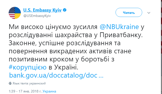Украинское представительство Америки написало в Twitter, что ценит усилия НБУ в расследовании мошенничества в национализированном банке, а также считает возвращение выведенных средств логичным и законным окончанием истории с махинациями и коррупцией.