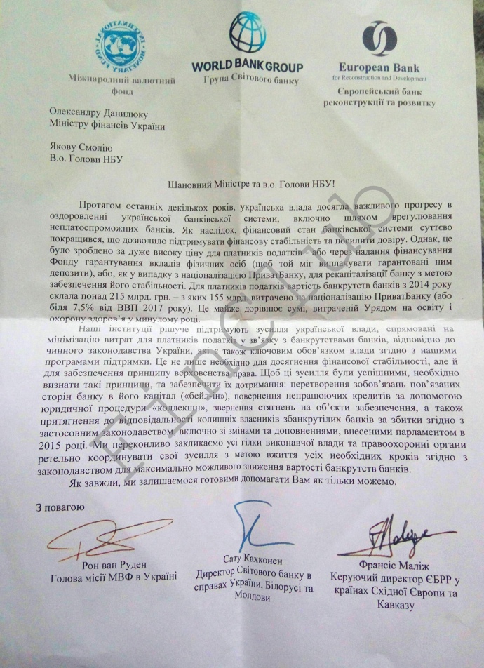 "Наши институции решительно поддерживают усилия украинской власти, направленные на минимизацию расходов для плательщиков налогов в связи с банкротствами банков, в соответствии с действующим законодательством Украины, которые также являются ключевым обязательством власти в соответствии с нашими программами поддержки", – говорится в письме кредиторов.
