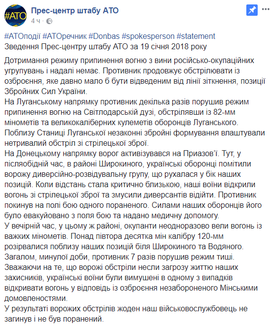 Об этом в субботу, 20 января, на своей странице в Facebook сообщает пресс-центр штаба АТО.