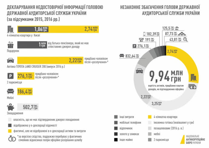 Кроме того, по мнению детективов Бюро, чиновница внесла заведомо недостоверные сведения в ежегодный е-декларации 2015 (более 2,86 млн грн.) и 2016 года (более 4,67 млн грн.).
