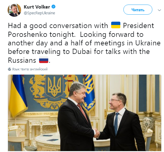 "Был хороший разговор с Порошенко. Еще полтора дня встреч в Украине перед тем, как отправиться в Дубай для переговоров с представителями России", - написал Волкер.