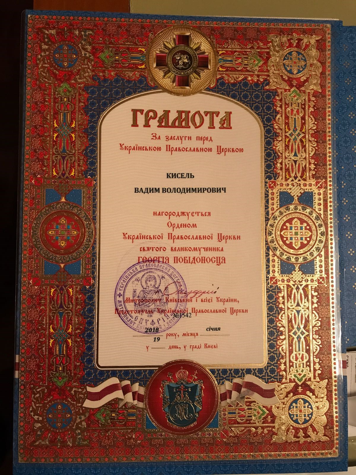 Украинская Православная Церковь в светлый праздник Крещения Господня наградила почетного президента Федерации Греко-римской борьбы Украины Киселя Вадима Владимировича орденом УПЦ Святого Великомученика Георгия Победоносца за весомый вклад в развитие православия и роспись Свято-покровского храма на Приорке в Киеве.