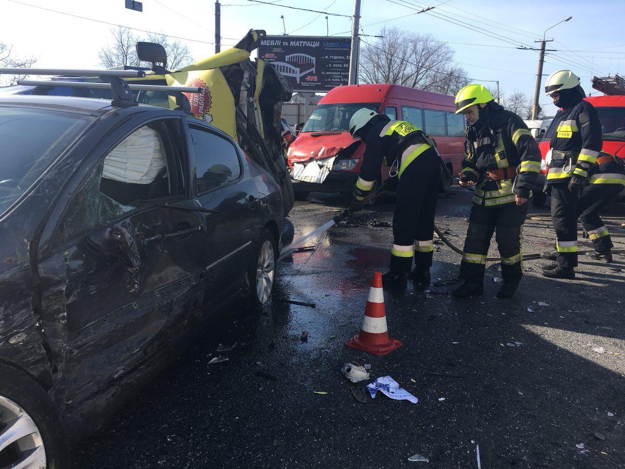 В Днепре на улице Янтарной столкнулись две маршрутки и Peugeot. В результате одна маршрутка перевернулась.