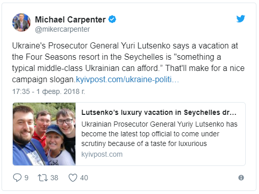 "Генеральный прокурор Украины Юрий Луценко говорит, что отдых на курорте" Four Seasons "на Сейшельских островах является "тем, что себе может позволить обычный украинец среднего класса ". Это может стать прекрасным избирательным слоганом", - написал Карпентер.