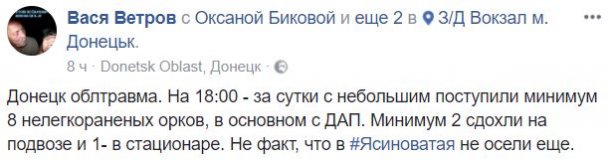 Согласно сообщению, в Донецкую областную клиническую травматологическую больницу по состоянию на 18:00 1 февраля из окресностей Донецкого аэропорта поступили не менее восьми раненых боевиков, причем двое боевиков скончались по дороге в больницу, а еще один – в стационаре.