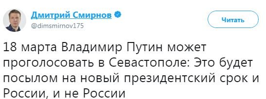 "18 марта Владимир Путин может проголосовать в Севастополе: это будет посылом на новый президентский срок и России, и не России", – написал Смирнов.