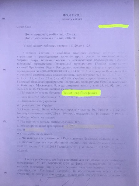 Адвокат Януковича Виталий Сердюк обнародовал скан-копии протокола допроса бывшего и.о. министра обороны Игоря Тенюха, в котором он рассказывает о том, как принималось решение сдать Крым. Соответствующие документы Сердюк во вторник, 6 февраля, опубликовал на своей странице в Facebook.