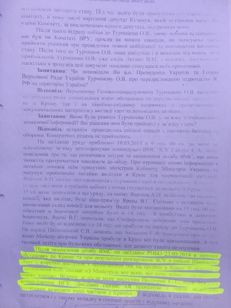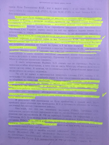 Вспоминая обстоятельства другого ключевого заседания СНБО, которое состоялось месяцем ранее, 28 февраля 2014 г., Тенюх заявил в протоколе допроса, что все предложения военных по обороне полуострова блокировались Арсением Яценюком, на тот момент уже назначенным на должность премьер-министра Украины.
