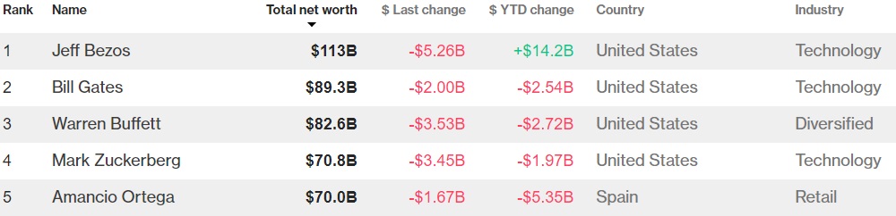 Так, самый богатый человек в мире – основатель компании Amazon Джефф Безос – потерял $5,3 млрд. Теперь его состояние оценивается в $113,2 млрд.