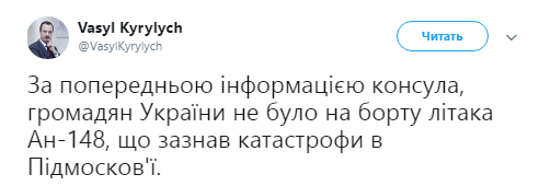 "По предварительной информации консула, граждан Украины не было на борту самолета Ан-148, потерпевшего крушение в Подмосковье", - говорится в сообщении.