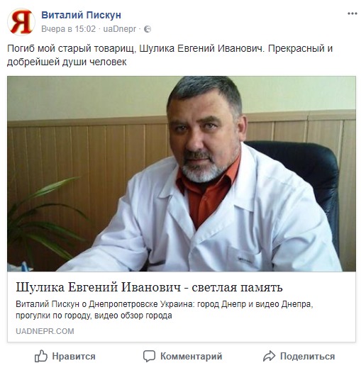 Об этом на своей странице в Facebook сообщил знакомый врача Виталий Пискун.