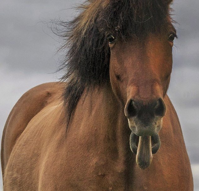 Мужчина проезжал мимо табуна лошадей и решил сфотографировать. Одно животное начало демонстрировать странные гримасы.