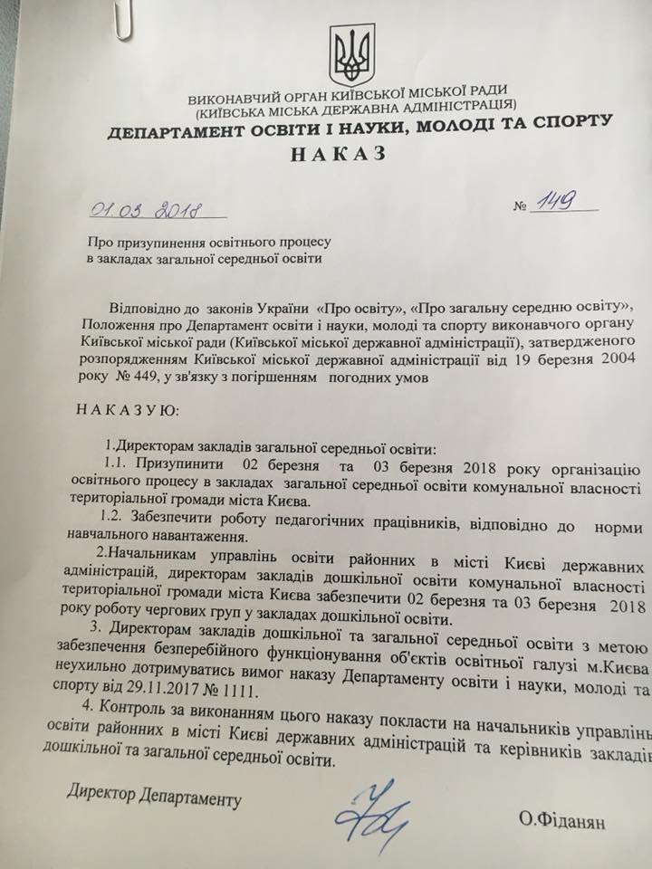Заместитель председателя Киевской городской государственной администрации Анна Старостенко обнародовала соответствующий указ на своей странице в Facebook.