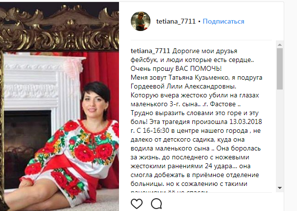Убийство 43-летней многодетной матери-одиночки Лилии Гордеевой в Фастове Киевской области потрясло многих украинцев. Женщине нанесли 24 ножевых ранения возле детского садика. Полиция города занята поисками убийцы, однако подозреваемого в этом страшном преступлении пока не задержали.