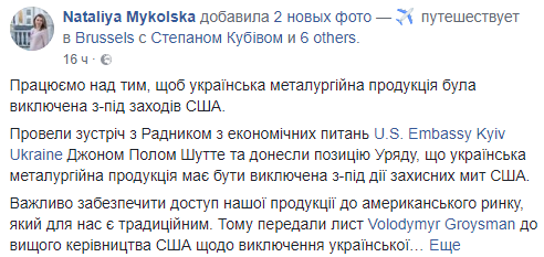 "Передала советнику по экономическим вопросам посольства США в Украине Дж. Полу Шутте письмо [премьер-министра] Владимира Гройсмана руководству США относительно исключения металлургической продукции из-под действия мер. Необходимо обеспечить доступ продукции к рынку США, который является традиционным", – написала Микольская на своей странице в Facebook.