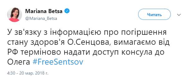 Информация о том, что незаконно осужденного в России украинского режиссера Олега Сенцова якобы отравили, является полной чушью.