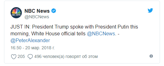 Днем ранее в Белом доме сообщили, что Трамп еще не звонил Путину и не поздравлял с переизбранием на пост главы государства. В Кремле выразии предположение, что Трамп письменно поздравит Путина.