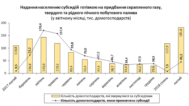 А вот субсидии на приобретение сжиженного газа, твердого и жидкого печного топлива выросли. Средний размер такой помощи составил 3203,7 грн, что на 44,5% больше, чем в январе-феврале 2017 года.