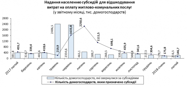 Также упало число желающих оформить субсидии. За январь-февраль 2018 года за помощью обратились 396 тыс. семей – в два раза меньше, чем в начале 2017 года. Субсидии назначили 322 тыс. домохозяйств. Сумма назначенный субсидий составила 352,1 млн грн.
