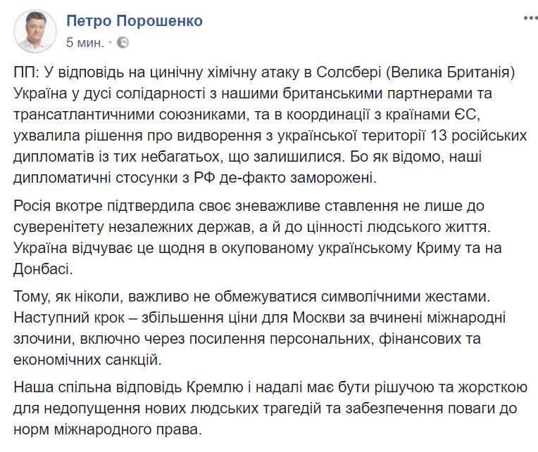 "В ответ на циничную химическую атаку в Солсбери (Великобритания) Украина в духе солидарности с нашими британскими партнерами и трансатлантическими союзниками, и в координации со странами ЕС, приняла решение о выдворении 13 российских дипломатов из тех немногих оставшихся. А как известно, наши дипломатические отношения с РФ де-факто заморожены", - написал президент.