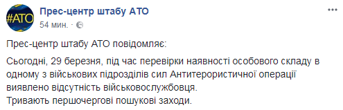 "Сегодня, 29 марта, во время проверки наличия личного состава в одном из военных подразделений сил Антитеррористической операции выявлено отсутствие военнослужащего. Продолжаются первоочередные поисковые мероприятия", – говорится в сообщении.