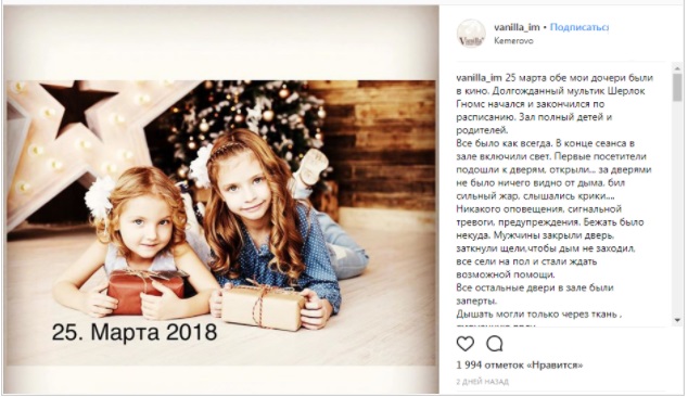 "25 марта обе мои дочери были в кино. Долгожданный мультик начался и закончился по расписанию. Зал полный детей и родителей. Все было, как всегда. В конце сеанса в зале включили свет. Первые посетители подошли к дверям, открыли... За дверями не было ничего видно от дыма, был сильный жар, слышались крики", — рассказала Ольга.
