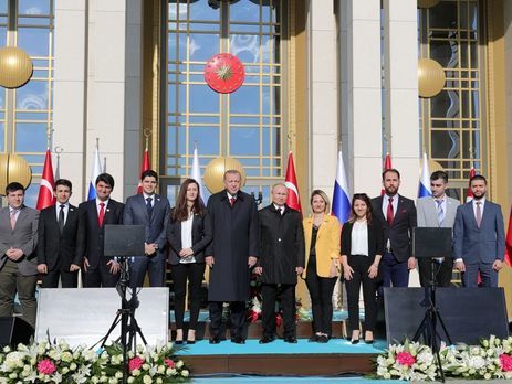 Поэтому Эрдоган попросил одну из них стать рядом, чтобы "сбалансировать" присутствующих для лучшего фото. Владимир Путин, тем временем, просто улыбался.