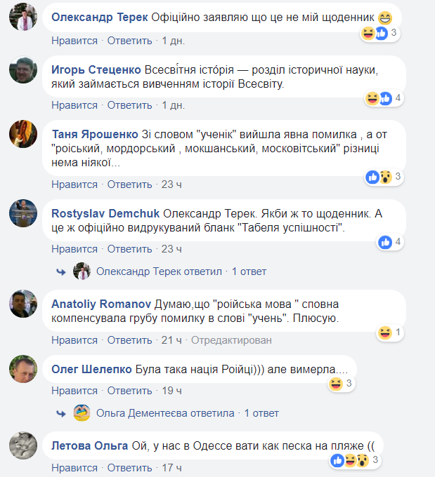 "Официально заявляю, что это не мой дневник", "Была такая нация роийци, но вымерла", "Думаю, что "роийский язык" вполне компенсировал грубую ошибку в слове "ученик". Плюсую", - пишут в интернете.