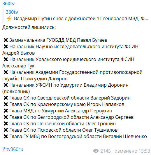 В числе тех, кто был снят с должности, оказались замначальника Главного управления по обеспечению безопасности дорожного движения МВД Павел Бугаев и руководитель Научно-исследовательского института (НИИ) ФСИН Андрей Быков. Кроме того, Путин уволил главу Уральского юридического института Министерства внутренних дел Александра Гука и ряд руководителей региональных управлений СК.