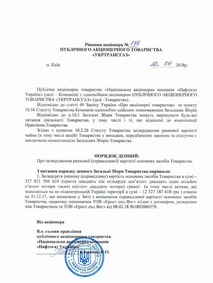 Данную оценку 12 апреля утвердил основной акционер "Укртрансгаза" - НАК "Нафтогаз Украины".