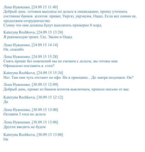 В связи с возобновлением выплат компенсации потерянных депозитов вкладчикам ликвидируемого «Дельта банка», Нужненко пишет Екатерине Рожковой и просит уточнить состояние банков агентов: ПриватБанк, Укргазбанк, Укрэксимбанк, Ощадбанк. И сообщает что «если с ними все в порядке, то продолжаем сотрудничество».