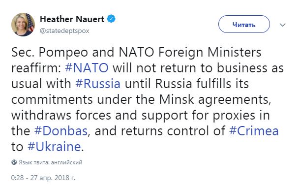 "Госсекретарь Помпео и министры иностранных дел стран НАТО подтверждают: НАТО не будет возвращаться к ведению дел с Россией, как обычно, пока Россия не выполнит свои обязательства по минским соглашениям, не выведет силы и не прекратит поддержку своих марионеток на Донбассе и не вернет контроль над Крымом Украине", - сообщила Нойерт.