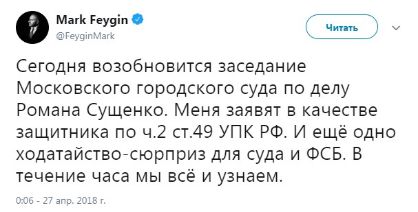 "Сегодня возобновится заседание Московского городского суда по делу Романа Сущенко. Меня заявят в качестве защитника по ч.2 ст.49 УПК РФ. И еще одно ходатайство - сюрприз для суда и ФСБ", - отметил Фейгин.