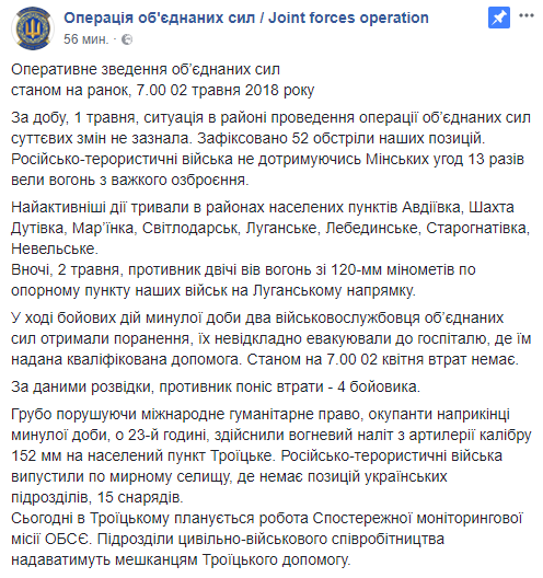 В ходе боевых действий прошедшие сутки два военнослужащего объединенных сил получили ранения и были госпитализированы. По состоянию на 7 утра 2 мая - потерь нет.