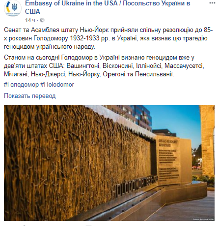 "Сенат и Ассамблея штата Нью-Йорк приняли совместную резолюцию к 85-й годовщине Голодомора 1932-1933 годов в Украине, признает эту трагедию геноцидом украинского народа", - заявили в посольстве.