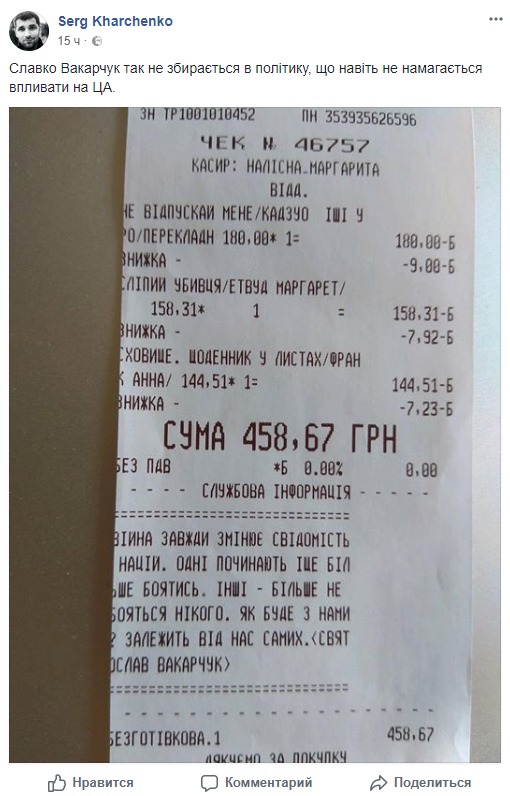 На чеках в одном из книжных магазинов в Киеве стали размещать высказывания музыканта Святослава Вакарчука.