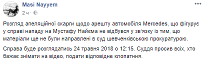 Маси Найем также сообщил, что не состоялось и рассмотрение апелляционной жалобы относительно ареста автомобиля Mercedes, который фигурирует в деле о нападении на парламентария. По его словам, в связи с тем, что Шевченковская районная прокуратура еще не направила в суд материалы.