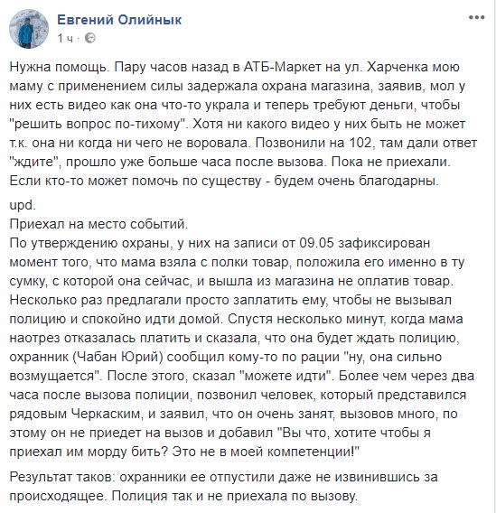 «Нужна помощь. Несколько часов назад в АТБ-Маркет на ул. Харченко (Бортничи, - Ред.) мою маму с применением силы задержала охрана магазина, заявив, мол у них есть видео как она что-то украла и теперь требуют деньги, чтобы «решить вопрос по-тихому». Хотя никакого видео у них быть не может, так как моя мама никогда и ничего не воровала», - написал он на своей странице в Facebook.