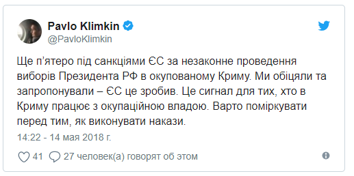 "Приветствую официальное решение Совета ЕС о введении санкций против пяти лиц, ответственных за незаконное проведение выборов президента РФ во временно оккупированном Крыму и Севастополе", - написал он.
