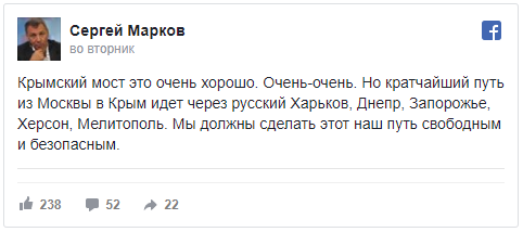По мнению представителя Владимира Путина, открытие Керченского моста на территории аннексированного Крмского полуострова является "хорошим шагом", однако самый короткий путь из Москвы в оккупированный Крым можно построить только после того, как Россия оккупирует Херсон, Мелитополь, Харьков, Днепр и Запорожье.