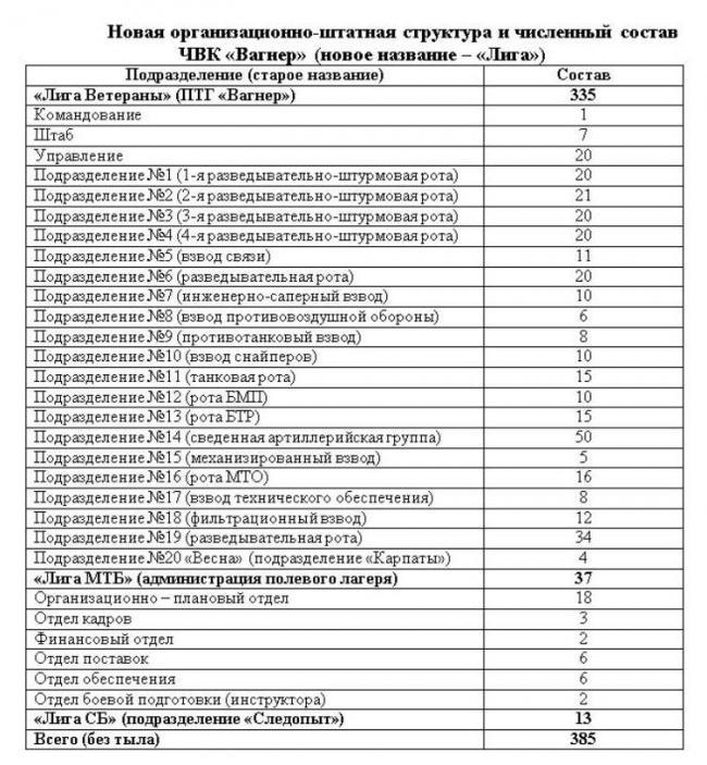 Теперь это незаконное вооруженное формирование состоит из основного боевого подразделения "Лига Ветераны", созданного на базе полковой тактической группы "Вагнер", подразделения "Лига МТБ" (бывшая администрация полевого лагеря), "Лига СБ" (бывшая группа "Следопыт") и тылового обеспечения.