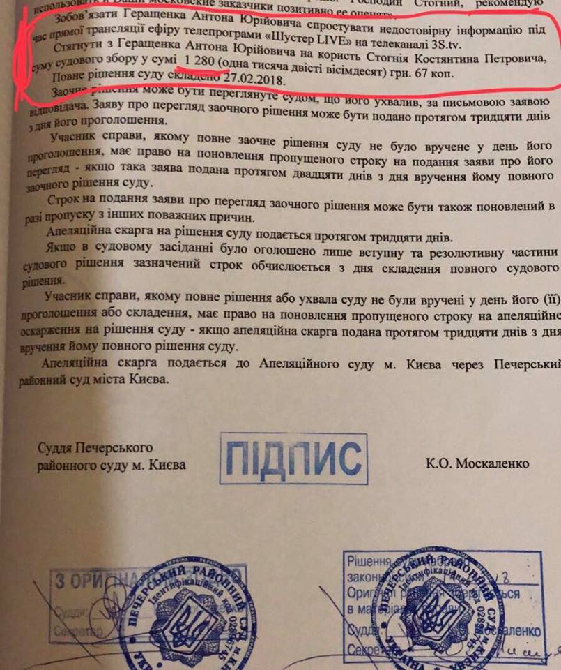 Основным требованием иска было признать недостоверной озвученную во время прямого эфира нардепом Геращенко информацию и обязать его ее опровергнуть.