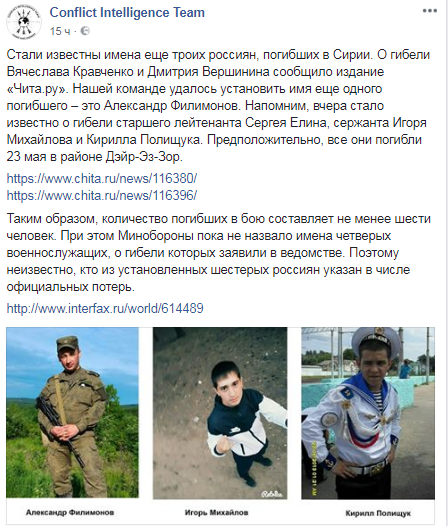 Ранее издание "Чита.ру" сообщало о смерти Вячеслава Кравченко и Дмитрия Вершинина. Также во вторник, 28 мая, стали известны имена еще троих погибших – старшего лейтенанта Сергея Елина, сержанта Игоря Михайлов и Кирилла Полищука. Предположительно, все они погибли 23 мая в районе Дэйр-ез-Зор.